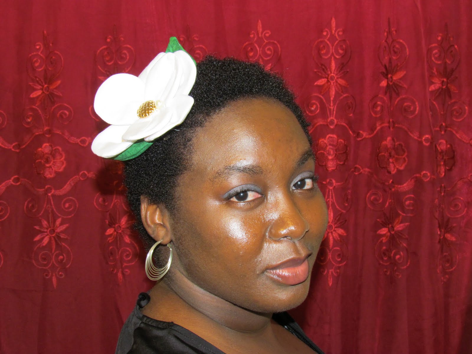 I tried. Really I tried to style my twa aka. teeny weeny afro ( I learned something new... haha). But the hair clip I made over powered everything. So, I put on my wig. pinned it up and made a nest for my flower to rest in. I will try and make another attempt tomorrow.